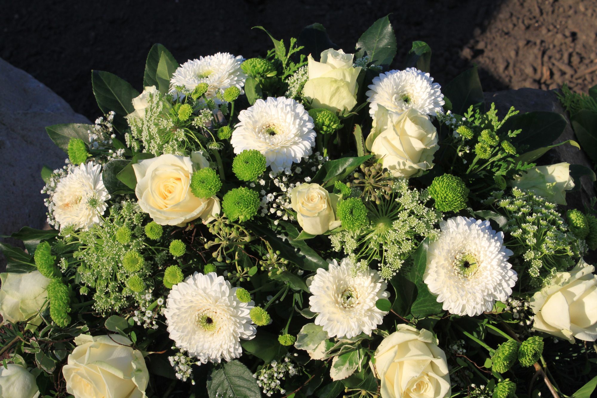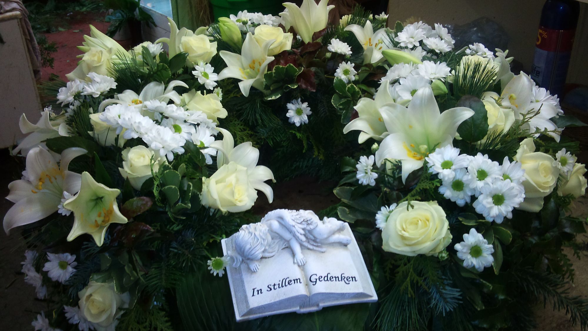 Wir fertigen Grabgestecke, Sarg- und Urnenschmuck, Trauerkränze, Legesträuße, Handsträuße, Kirchendekoration, Trauerhallendekoration und Herzen.